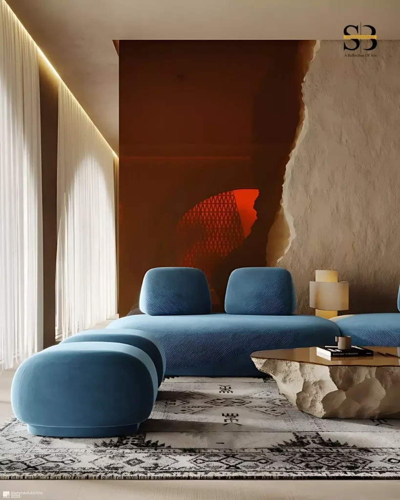 The deep blue contrasts beautifully with the warm camel tone, making your living room feel sophisticated yet cozy.
