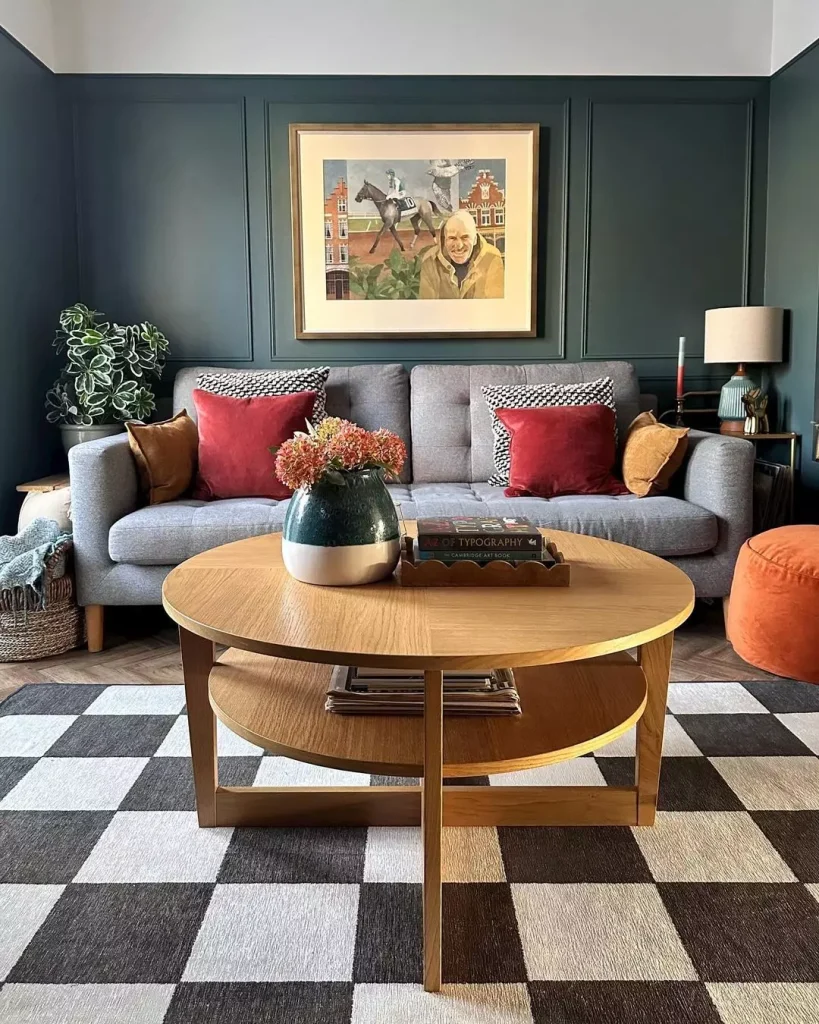 I tried this look with a rustic coffee table and a wooven basket for storage. Instantly, my navy sofa felt right at home, grounded by the warmth of the wood.