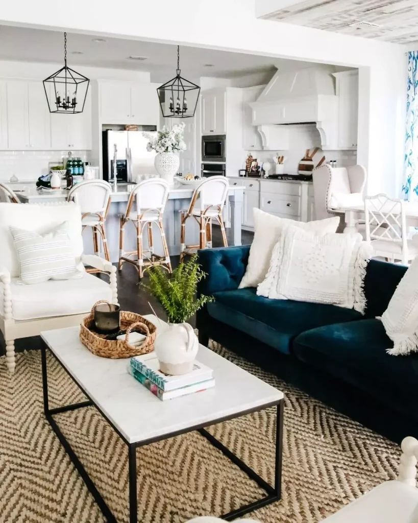 If you’re into a touch of glam, velvet accents can bring that cozy yet chic vibe to your navy sofa.