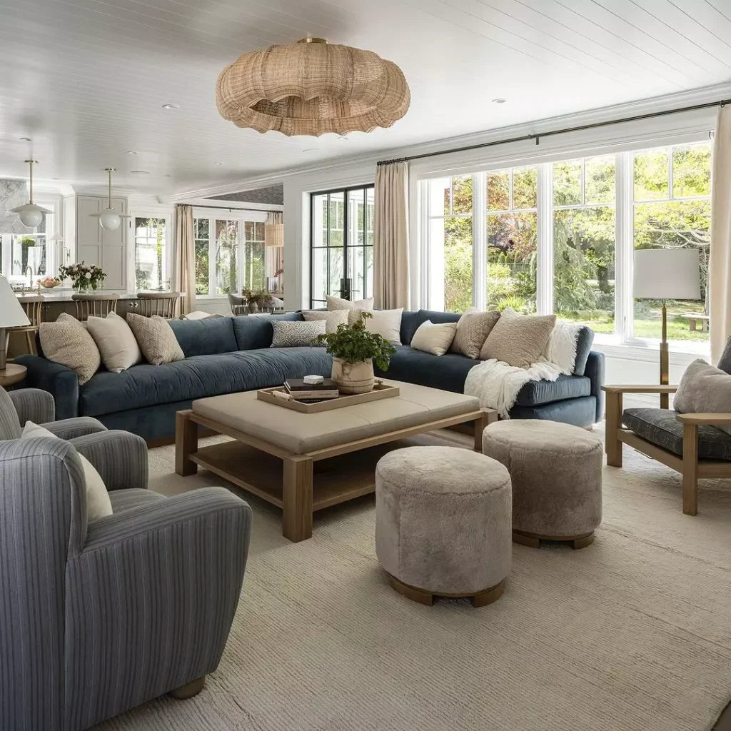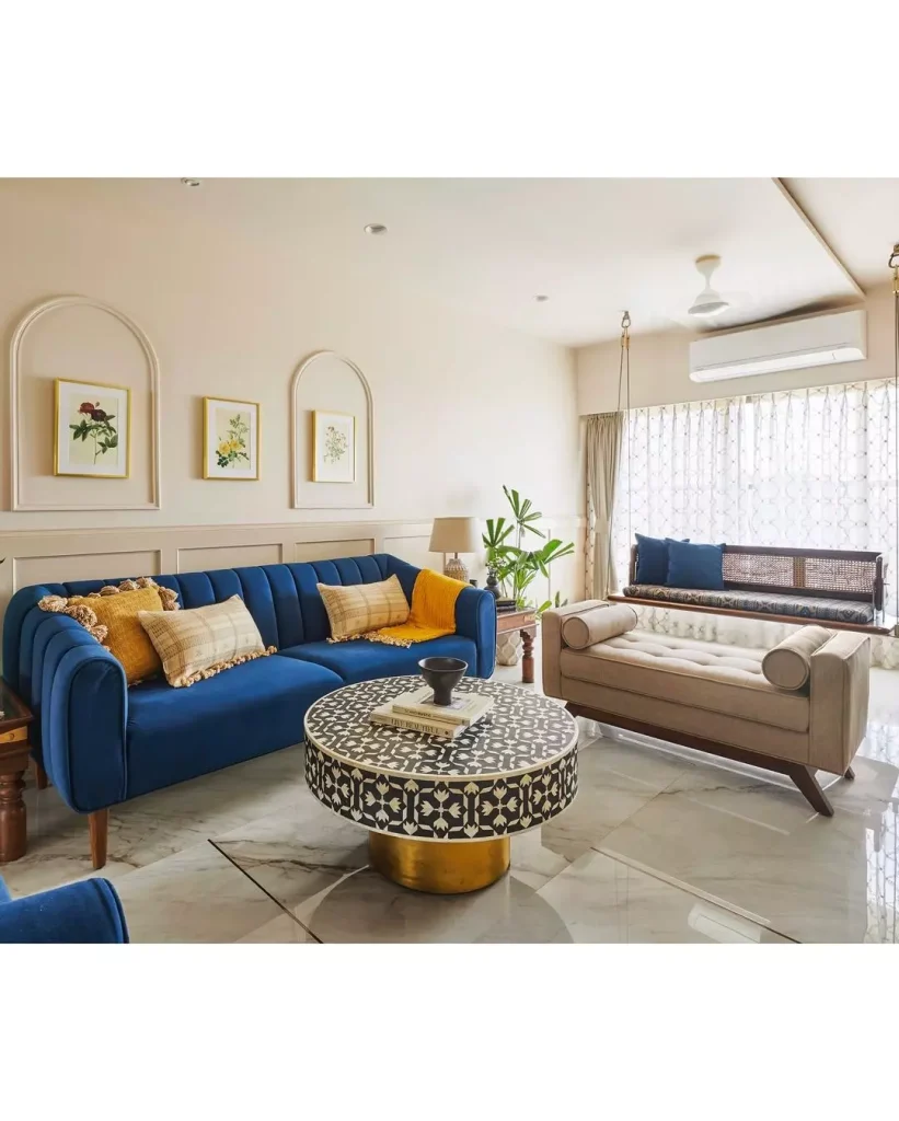 I added sandy beige pillows, a light throw, and a coffee brown table next to my navy sofa, and instantly the room felt like coastal escape.
