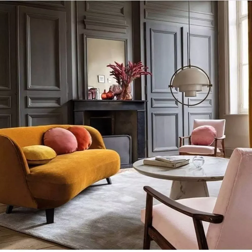 An orange couch against a dark wall like navy, charcoal, or even black, creates an incredibly dramatic effect.