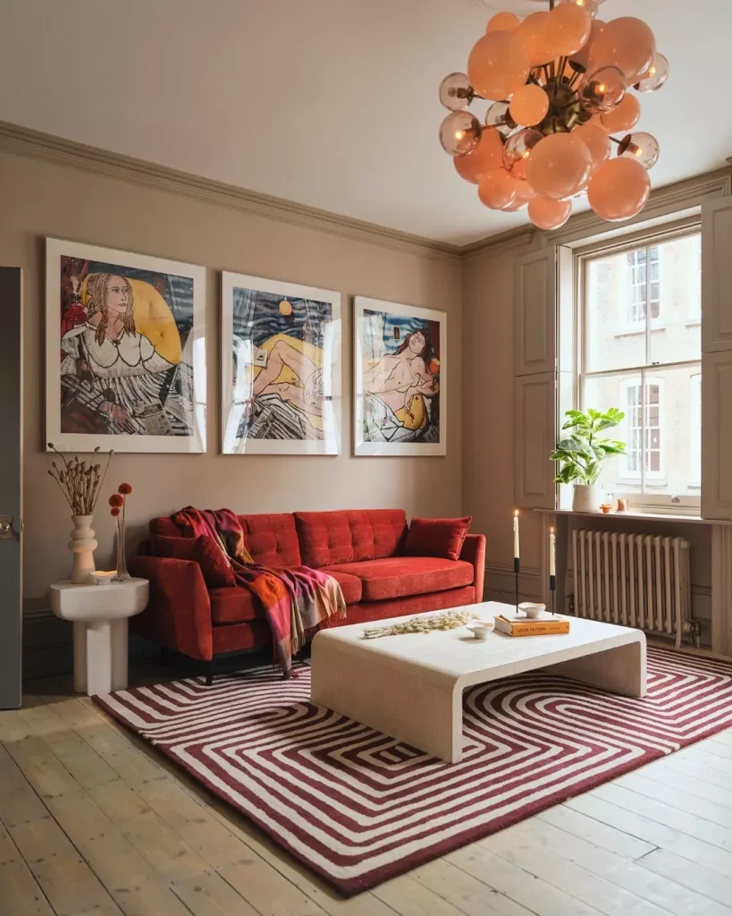 Red light fixtures can be a fun, unexpected way to bring in the color without committing to large furniture pieces. A red pendant light over your coffee table, or a quirky red lamp on a side table, can add a playful, stylish touch while casting a warm glow over the room.